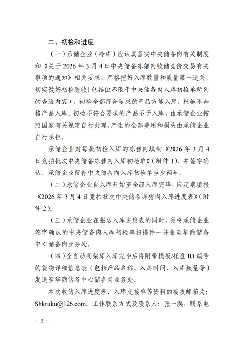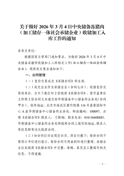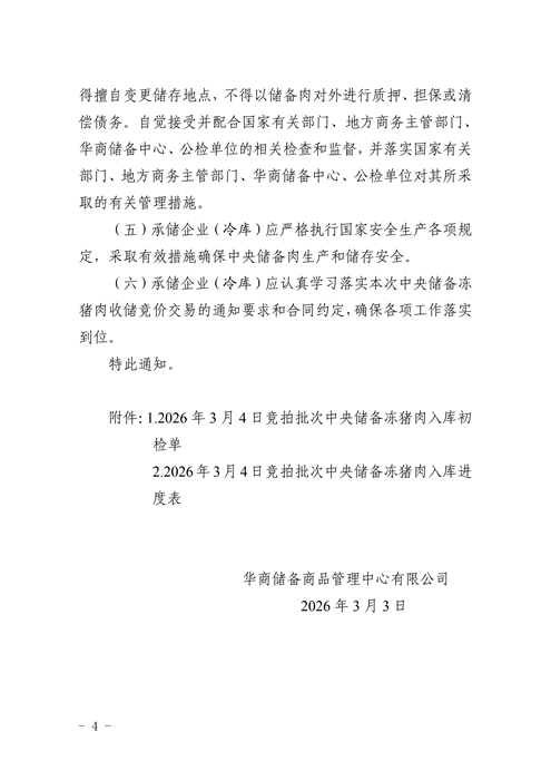 關于做好2026年3月4日中央儲備凍豬肉(加工儲存一體社會承儲企業)收儲加工入庫工作的通知